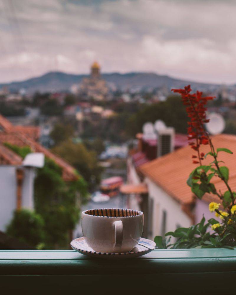 Приходи сюда утром в будние дни для неспешных завтраков с видом на просыпающийся город и обязательно заказывай кофе, сваренный на песке, и порцию грузинских сладостей.
