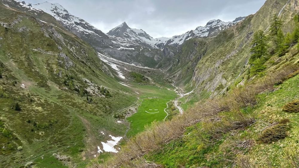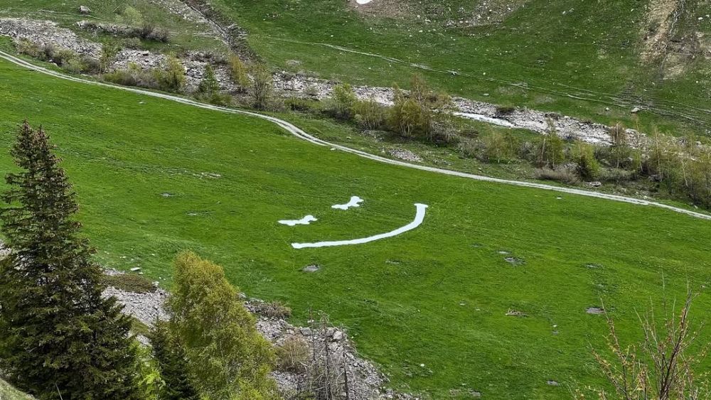 80-метровый эмоджи создан из переработанных материалов. На фото видно, что смайлик особенно хорошо виден с высоты гор.