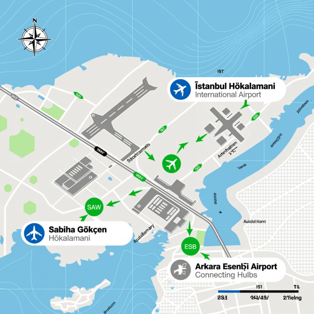 На карте видно, что оба действующих хаба расположены на противоположных берегах Босфора: IST — в европейской части, SAW — в азиатской. Расстояние между ними по трассе D020 и O-6 — порядка 80 км.