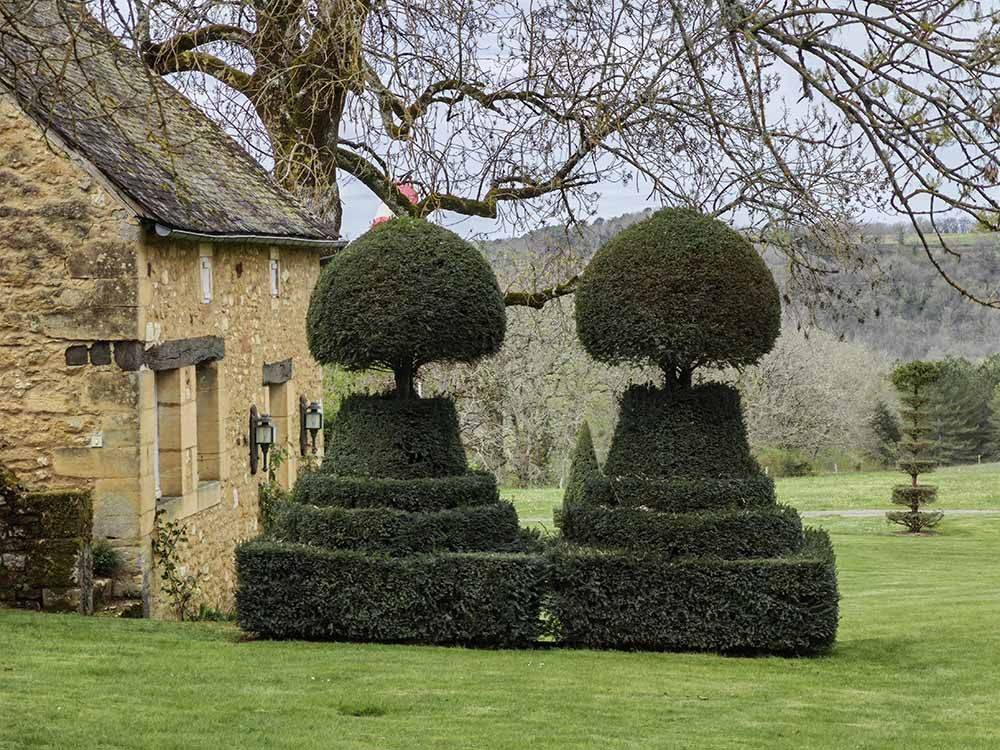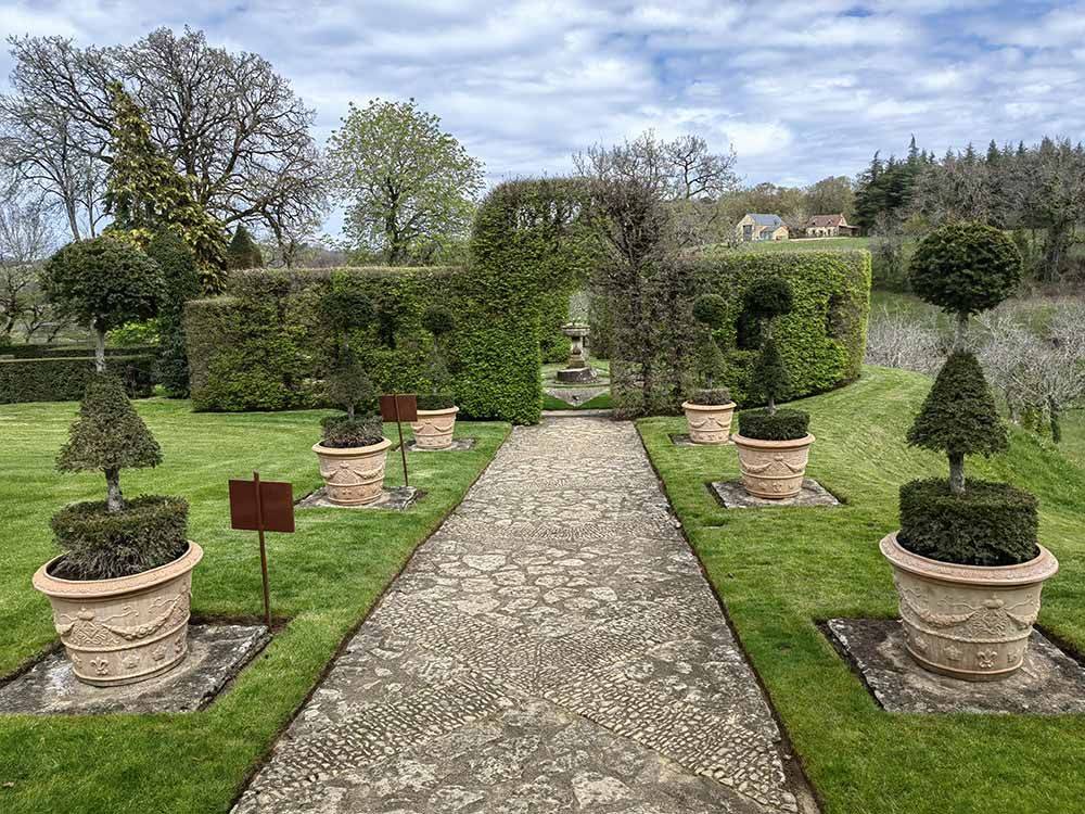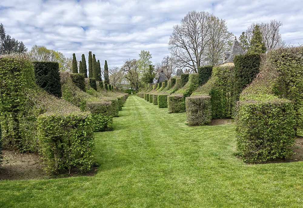Французские сады — это зелёные поляны и разнообразие разных фигур, выстриженных из деревьев и кустарников. Летом к этому великолепию добавляются ещё и цветы. Мы были там в начале апреля, так что цветов видели немного — в основном нарциссы и тюльпаны. Зато цветут яблоневые деревья и начинает распускаться глициния!