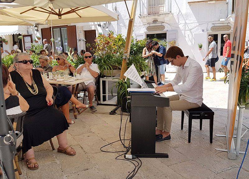Народу было много. ОФицианты разносили еду тем, кто утроился в ресторанах на площади, но многие просто устроились, кому где удобно, чтобы послушать музыку.