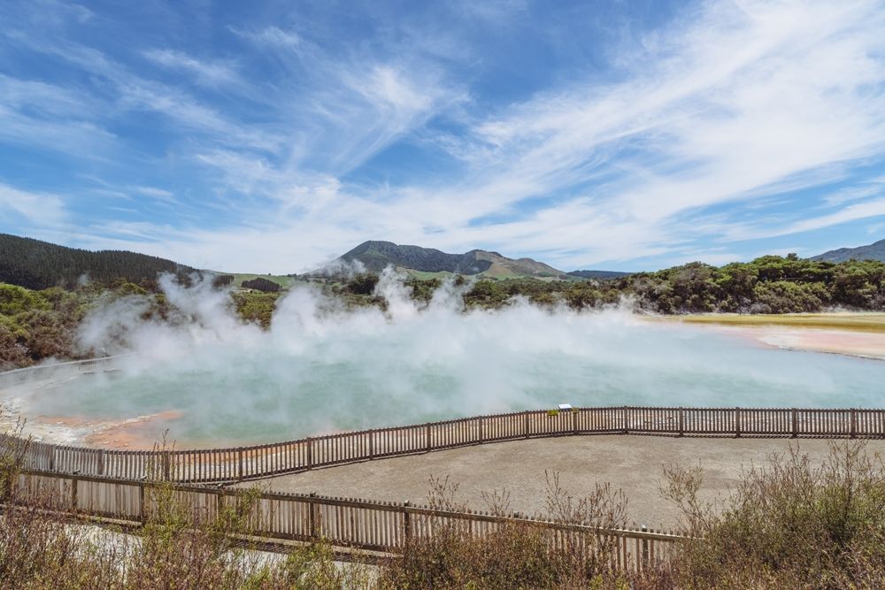 Геотермальная активность и изобилие горячих источников — ещё одна особенность Новой Зеландии. Мы уже писали о курорте Роторуа, куда приезжают отдохнуть в спа-центрах и получше узнать культуру маори; оттуда можно доехать до Ваймангу, одного из самых больших гейзерных парков в стране. Маори называли эти места страной горячей воды, и название полностью себя оправдывает: долина представляет собой масштабную гидротермальную систему с дымящимися кратерами, горячими источниками и гейзерами, выбрасывающими пар и воду. Из-за сероводорода воздух здесь наполнен характерным запахом, а клубы пара поднимаются над землёй даже в прохладную погоду. Туристические тропы проходят мимо озёр с необычными оттенками воды, включая знаменитое Frying Pan Lake, где из-за газов создаётся эффект