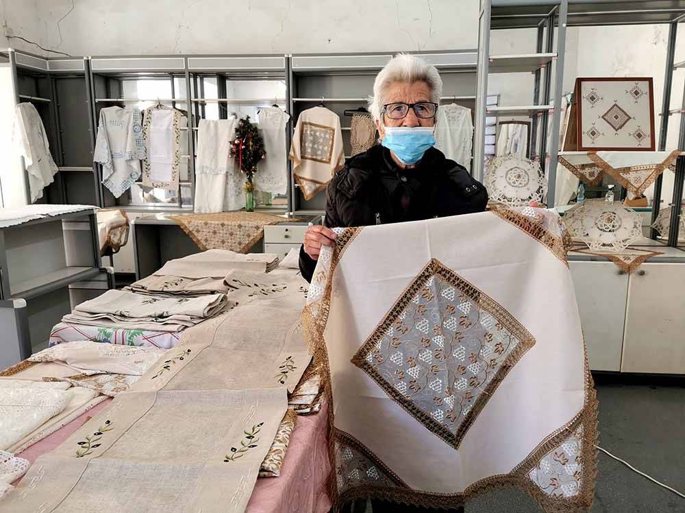 Скатерти мне были не нужны, но отказаться было невозможно. А она воодушевленно рассказывала, разглаживая тонкие, расшитые шелком, материи маленькой, натруженой рукой. «Вот эту салфетку я делала пять часов», — выкладывает небольшую вышитую вещицу с оливками и цветами, «А эту – неделю, а эту – месяц!» Я залюбовалась скатертью, которую она разложила на столе. «Вы одна ее делали?» — уточнили мы. Она заулыбалась: «Нет, всей семьей». Приехав в деревню Лефкара, зная, что тут живут потомственные мастерицы, я планировала купить тут что-то в подарок родным. Конечно же, сразу захотелось сделать это в этой лавке)))