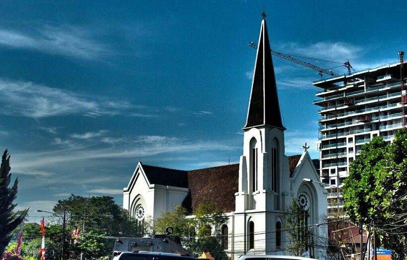 Здание выполнено в неоготическом стиле, его венчает высокий шпиль. Здание расположено в самом центре Бандунга, в окружении небоскребов, что несколько мешает восприятию его величественной красоты.