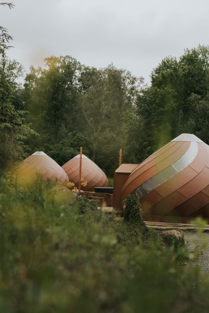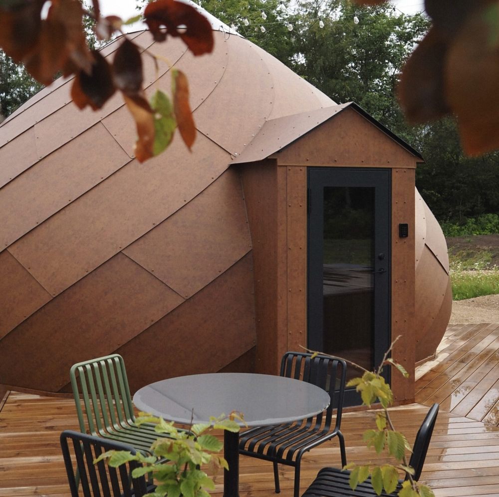 На фотографиях они сразу цепляют взгляд. Округлые формы, обшивка тёплого медного оттенка, аккуратная посадка в ландшафт — кажется, будто эти купола не построили, а «вырастили» прямо из земли.