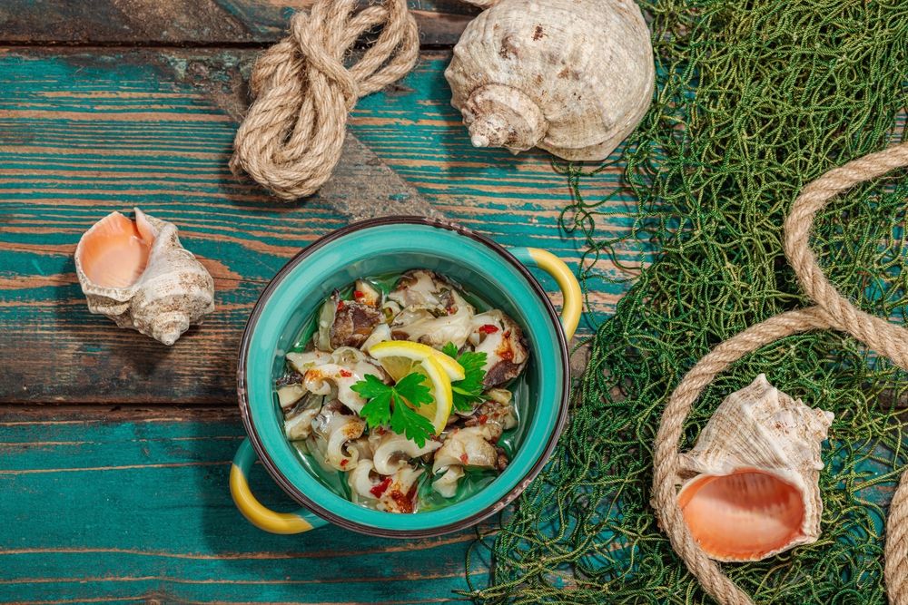 Готовят моллюсков просто: слегка отваривают, вынимают из раковины и быстро обжаривают с маслом и чесноком или подают в тёплых салатах. Весной мясо остаётся упругим и сочным — именно за эту текстуру и любят сезонный сочинский рапан.
