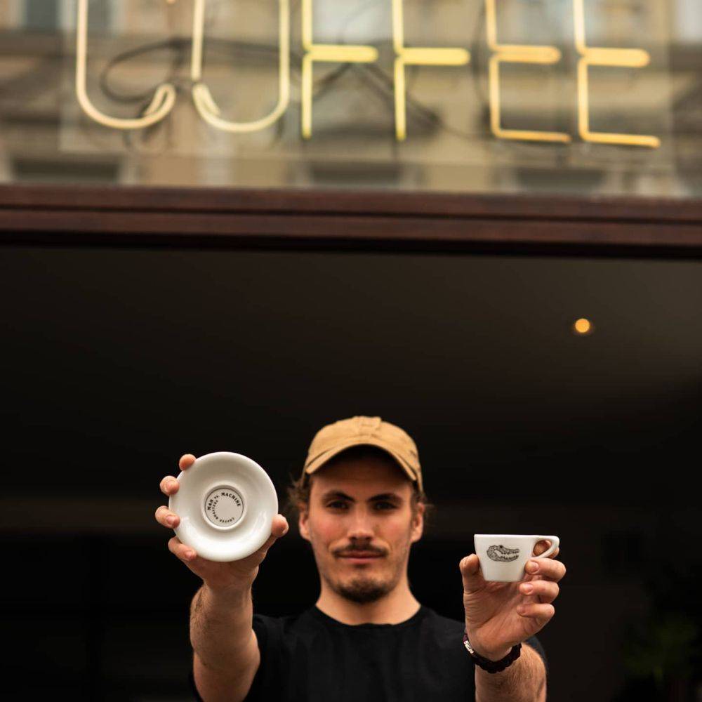 На логотипе Man Versus Machine изображен крокодил, он же красуется тут на каждой чашке, кофемашине и даже на стенах. А еще в заведении можно купить классный и качественный мерч: облачившись в футболку с тем самым крокодилом, сразу станешь частью комьюнити мюнхенских модников и любителей качественного кофе.