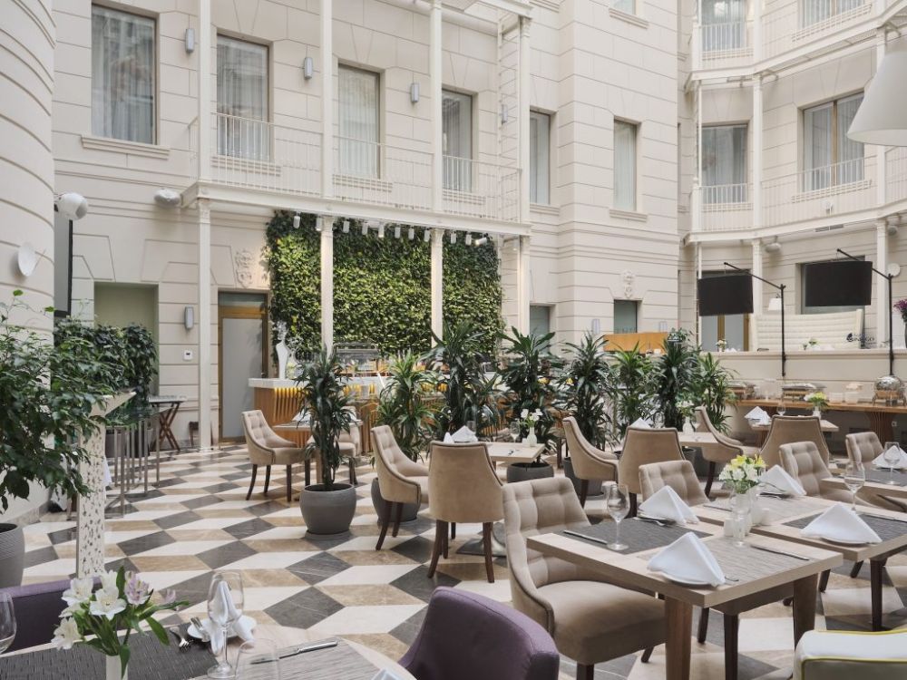 Пятизвёздочный отель в центре Москвы для тех, кто любит отдыхать роскошно: здесь больше двухсот номеров, оформленных в стиле ар-деко с лепниной и хрустальными люстрами. А в ресторане Cafe Imperial можно попробовать блюда средиземноморской кухни с французскими нотками: тартары, крудо из морепродуктов, морских ежей и устриц. Ещё здесь подают отличные авторские коктейли. Детское меню тоже есть, так что можно смело бронировать столик для всей семьи — это, кстати, желательно сделать, если хотите попасть на ужин, ресторан очень популярен. В 2023 году он получил звание «Лучший ресторан в отеле» по версии PR Insider Travel Awards.