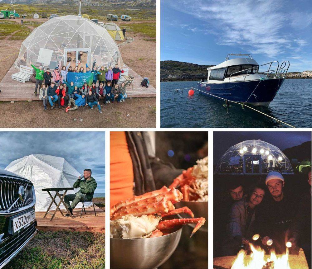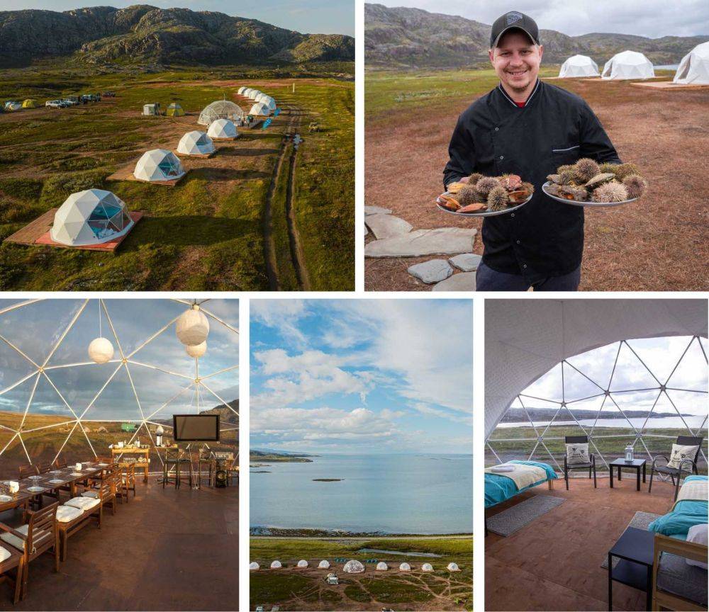 Комфорт в условиях дикой природы. Глэмпинг — это купольный кемпинг прямо на берегу Баренцева моря. В нем уютные шатры с удобными кроватями. Панорамный купол с камином и общей зоной отдыха. Есть электричество, зона умывания, благоустроенные туалеты и баня. Ужины готовит профессиональный шеф-повар — вы попробуете блюда высокой экспедиционной кухни из местных деликатесов и морепродуктов.