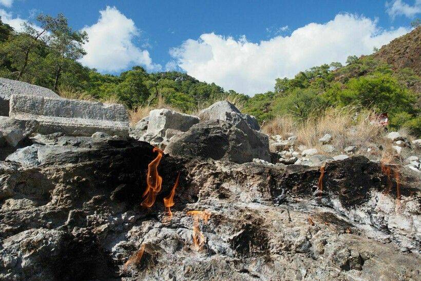 По легенде, основанной на «Илиаде» Гомера, рядом с этой местностью жила Химера — чудище с головой льва, телом козы и хвостом змеи. Мифическое создание дало название городу Кемер. Герой произведения Беллерофонт победил Химеру и заточил ее внутри горы. Но чудовище не погибло, а стало извергать огонь из недр земли. Это самое пламя туристы могут наблюдать и в наше время.