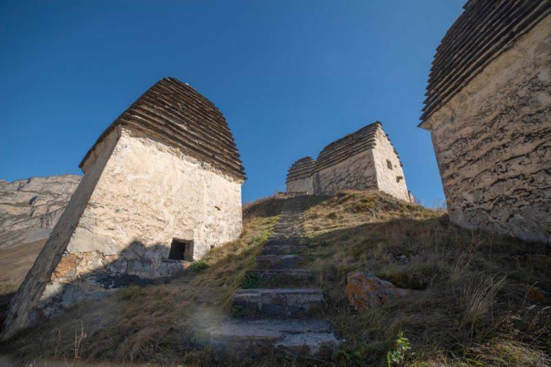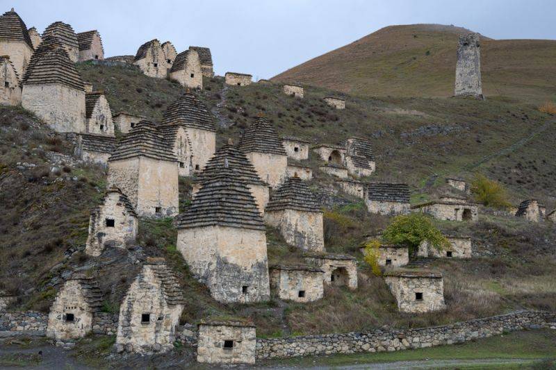 Даргавс представляет собой древний некрополь на скале близ одноименного поселка в Северной Осетии. Он включает в себя 95 каменных склепов, самым старым из которых 700 лет. Даргавский некрополь прозвали Городом мертвых потому, что он выглядит так же, как обычный город: дома, улицы, только людей нет. Во всяком случае, живых.