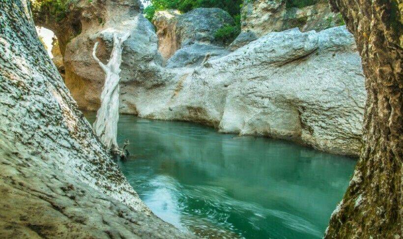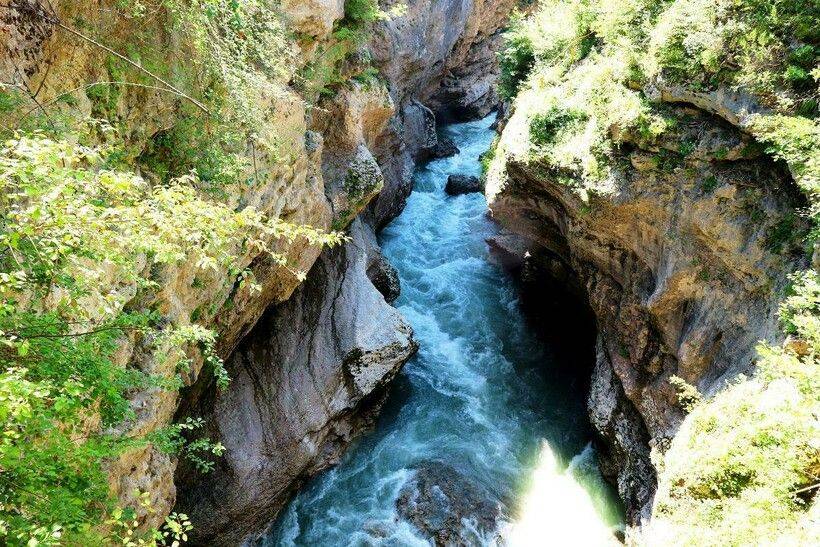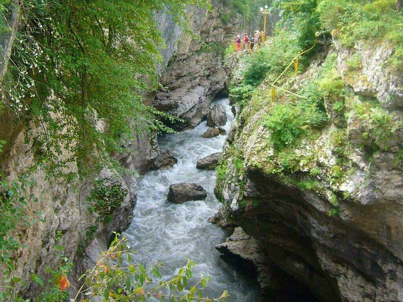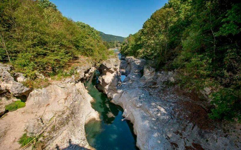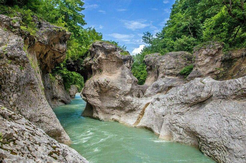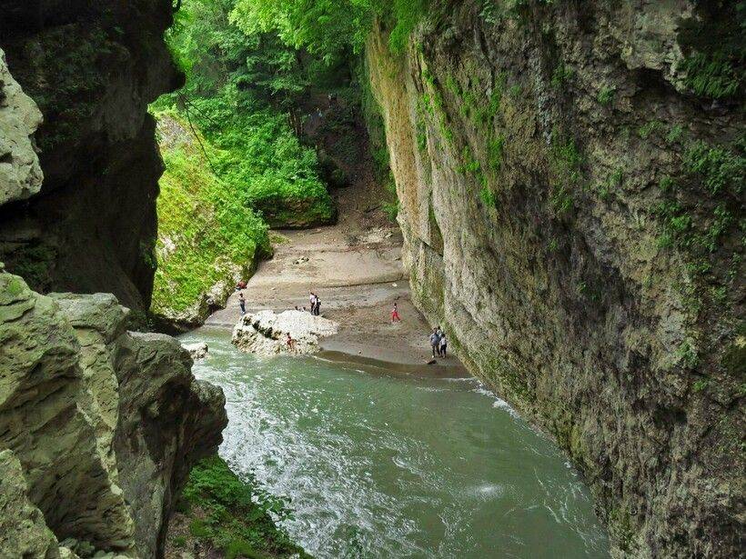 Знаменитое ущелье Адыгеи тянется среди обвитых лианами известняковых скал на 500 м. Средняя ширина каньона составляет 5–7 м, в некоторых местах расщелина сужается до 2 м. На дне 40-метровой пропасти пробивает себе путь река Белая.