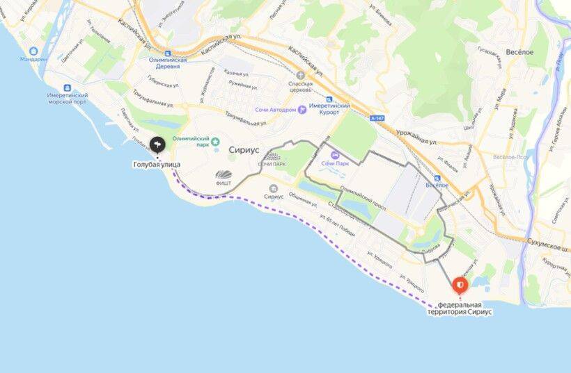 Прогулочные и велосипедные дорожки набережной, обсаженные пальмами, проходят вдоль отелей и пляжей мыса Адлер, микрорайона Сириус. Начинаясь от улицы Голубой, прогулочная зона возле Олимпийских стадионов расширяется, переходя в обрамление парка. Гостям курорта, плохо знающим город, искать, где находится Имеретинская набережная, нужно возле Олимпийского парка, до которого легко добраться из любого уголка Большого Сочи.
