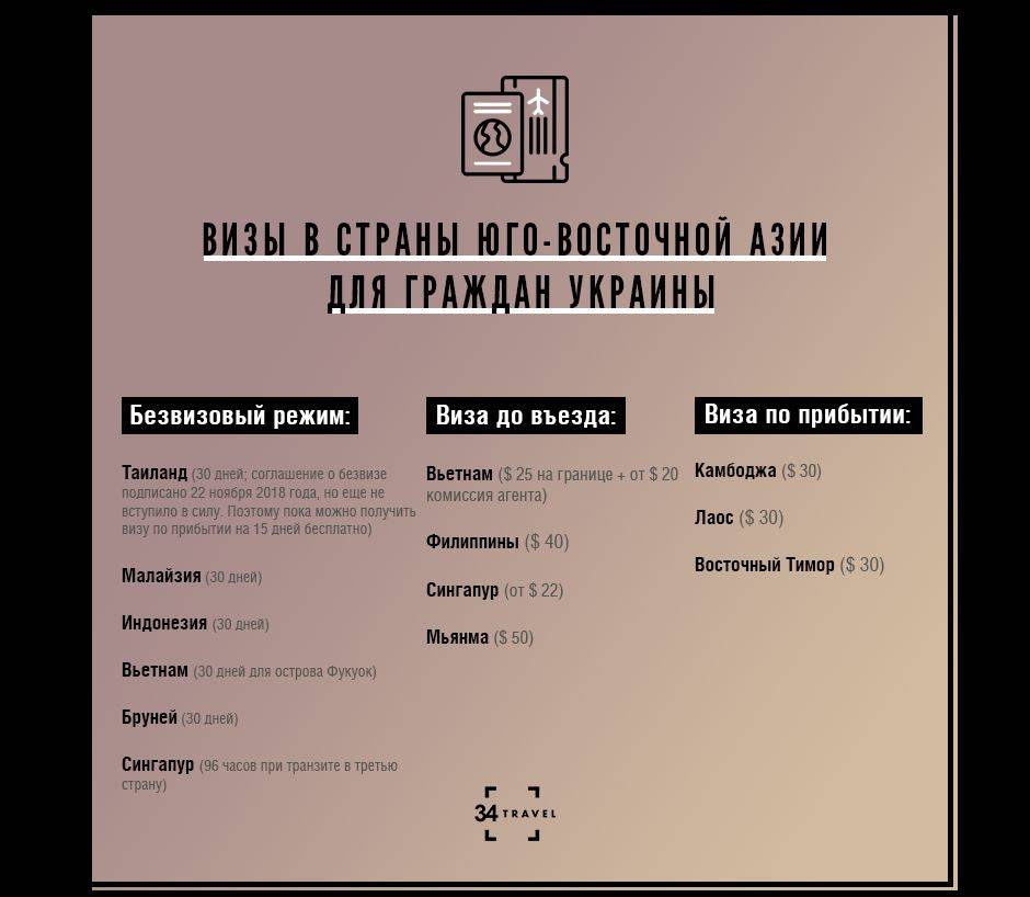 Таиланд: соглашение о безвизе подписано 22 ноября 2018 года, но еще не вступило в силу. Поэтому пока можно получить визу по прибытии на 15 дней. Когда соглашение заработает, находиться без визы в Таиланде украинцы смогут 30 дней. Затем можно будет продлить штамп еще на 30 дней.