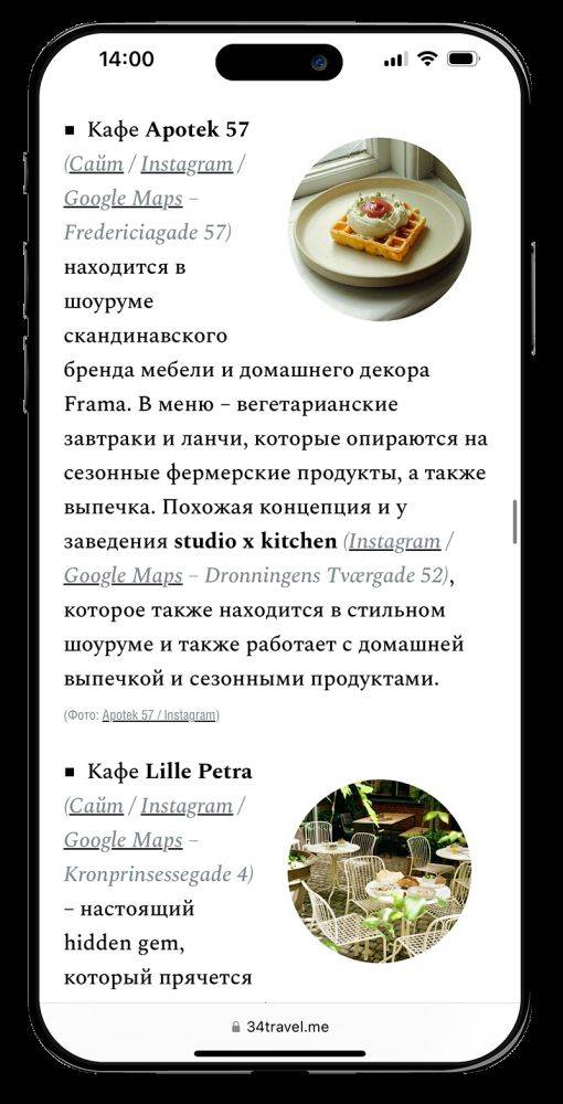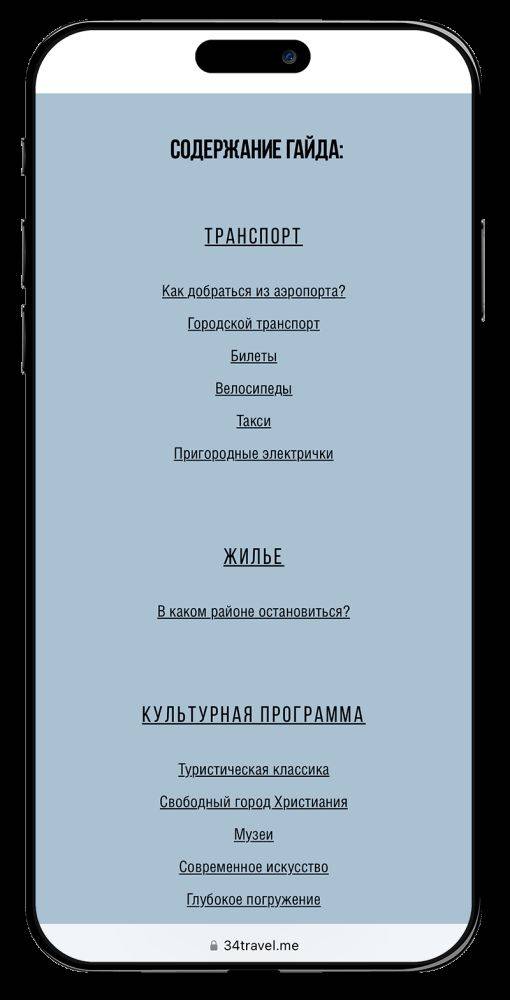 Привычные разделы гайдов 34travel – «Культурная программа», «Еда», «Бары» и другие – обрели новый вид. Структура стала нагляднее, а навигация – проще. Чтобы палец не устал от бесконечного скроллинга, быстро переключаться между пунктами гайда можно с помощью ссылок-якорей в конце каждого раздела и в содержании.