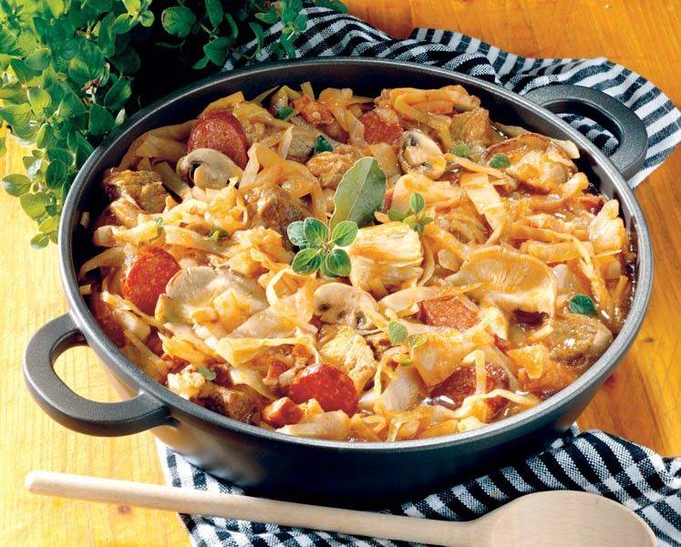 Это старинное польское блюдо. Основные ингредиенты – нашинкованная квашеная капуста, свежая капуста (иногда используют только квашеную), различные виды мяса и колбас, сушеные грибы, чернослив, лук и специи.