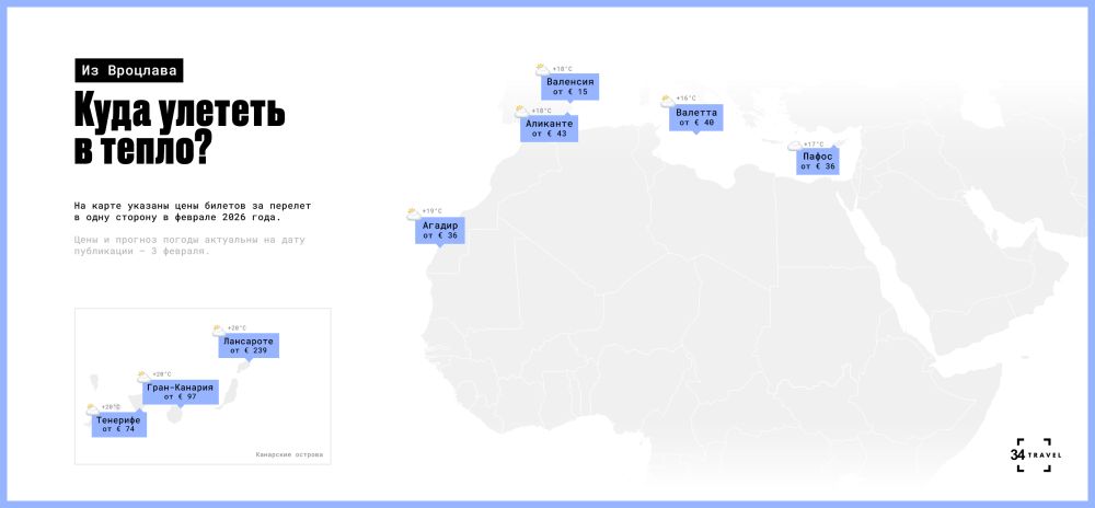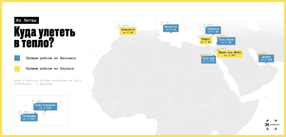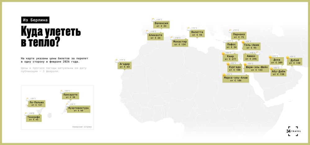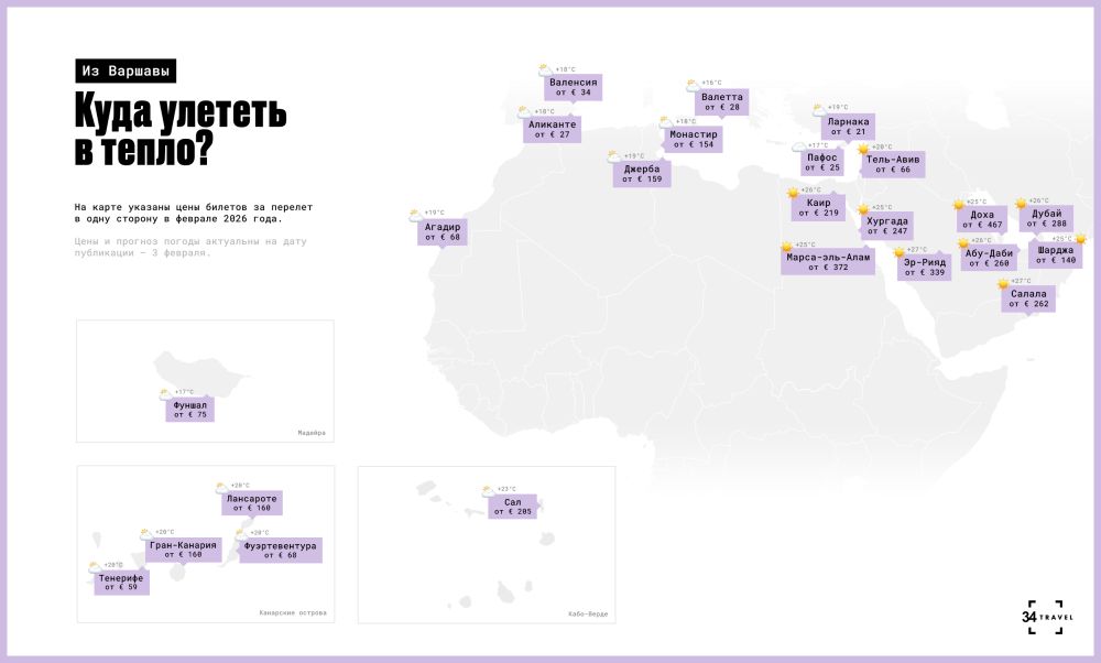 В подробку вошли направления в пределах 5–6 часов полета, в которых ожидается солнечная погода с температурой воздуха не ниже +15°C.Кликни на картинку, чтобы открыть ее в полном размере.