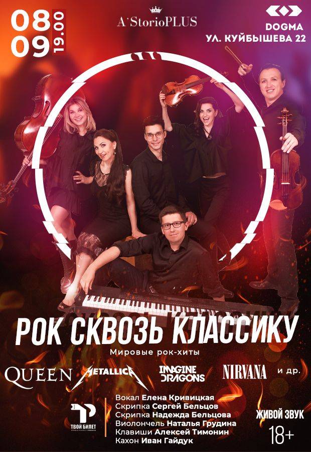 Если ты из тех, кто любит интерпретации золотых рок-хитов в классическом ключе, то вот дата и место, где всеми узнаваемые треки Queen, Metallica, Scorpion’s, Nirvana, Toto, Imagine Dragons будут исполнены женским голосом под струнные, клавиши и кахон. Состав A'StorioPLUS и сам по себе довольно нетипичный, чтобы захотелось его послушать, но эту музыкальную магию будет еще и дополнять