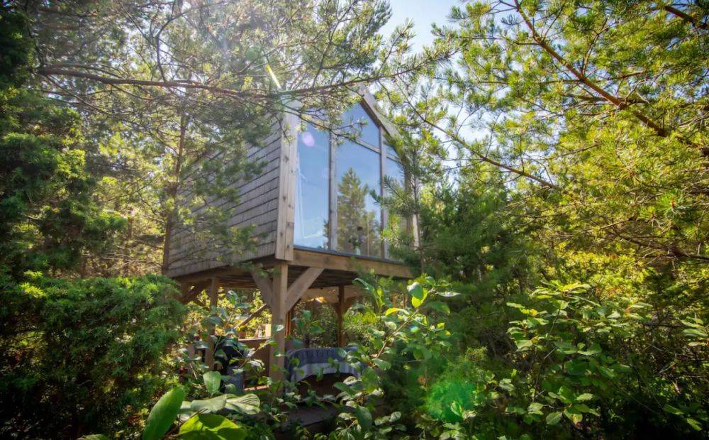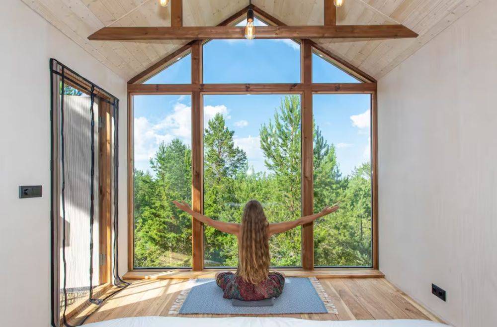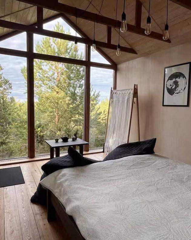 Пространство спальни, выполненное из натурального дерева, почти на уровне сосновых верхушек. Огромная стеклянная стена на северной стороне наполняет комнату светом и делает природу её естественным продолжением. Лежа в постели или сидя в кресле у окна, можно наблюдать, как рассветы окрашивают небо, а звёзды ночами мерцают в кронах деревьев. Интерьер продуман до мелочей: высокие потолки, уютный свет от дизайнерских ламп, мягкие кресла-мешки, деревянный пол из широких островных досок и текстиль приглушённых тонов создают обволакивающую атмосферу тепла и уюта. Для прохладных вечеров предусмотрено отопление — комната хорошо держит тепло, а в жару её естественным образом охлаждает лесная тень.