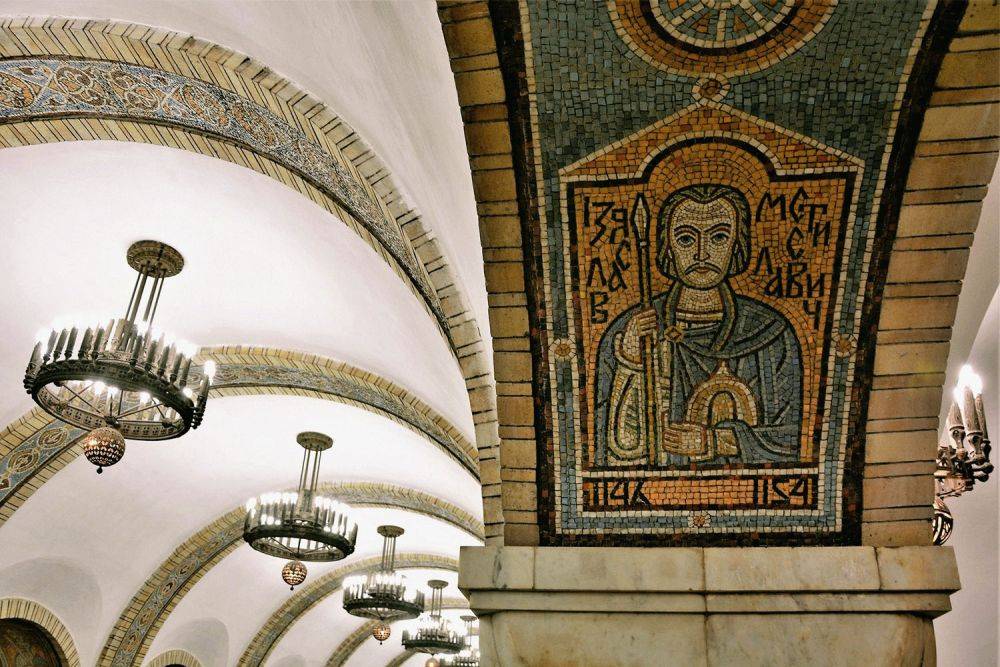 Почти каждый год эта станция входит в разные топы самых красивых в Европе и мире. По «Золотым воротам» можно изучать историю Киевской Руси. Из арок на платформе на пассажиров благостно глядят правители Киева: начиная с Кия, Щека, Хорива и сестры их Лыбеди (именно они считаются основателями города) и заканчивая Данилой Романовичем. Рядом с князьями расположились и великие деятели – Нестор-летописец с компанией. В пролетах – панно со старинными соборами. Обойди станцию от эскалаторов по часовой стрелке – и получи краткий курс истории. Все мозаики расположены в хронологическом порядке.