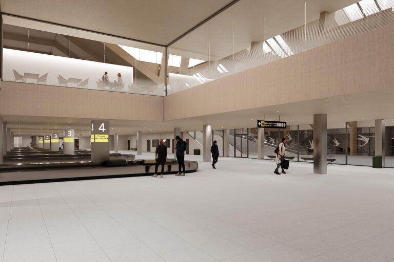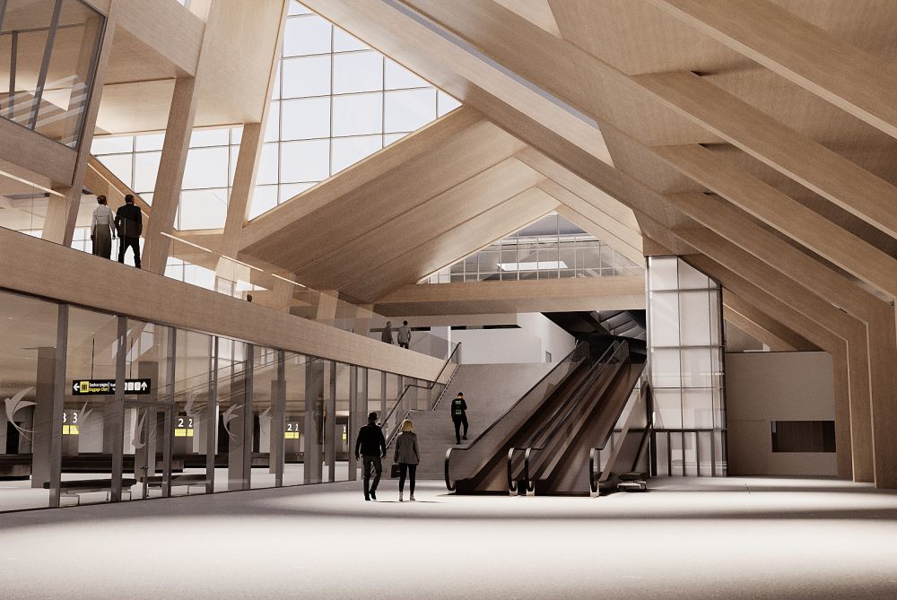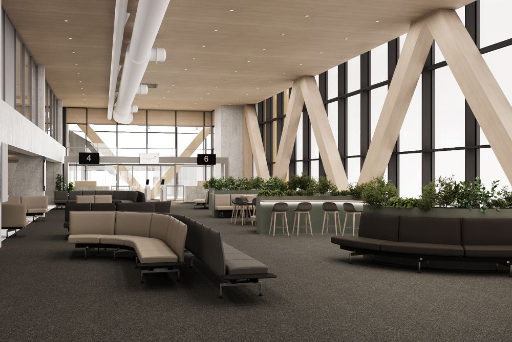 При строительстве используется большое количество натурального дерева, создаются просторные и светлые помещения с видами на взлетно-посадочную полосу и в сторону города.