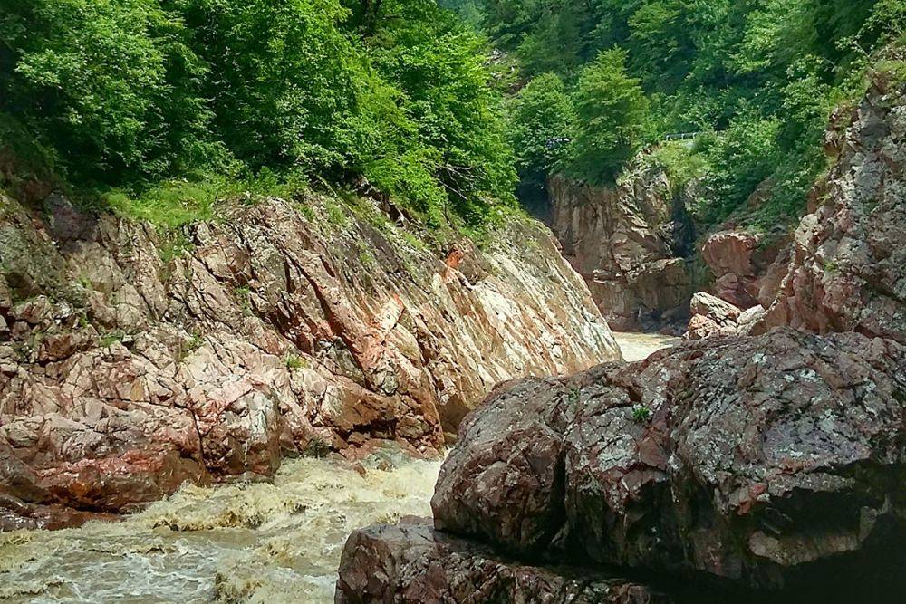 Гранитный каньон: здесь река бирюзового цвета, берега из монолитного гранита разных оттенков: красного, коричневого, серого цвета, вдоль берега растет бук, сосна, рододендрон, папоротники и множество цветов.