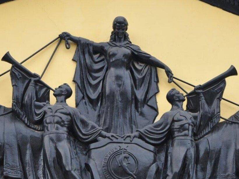 ЭТО ИНТЕРЕСНО! Фасад здания оформлен в духе советского неоклассицизма. По обе стороны от главного входа размещены фигуры акробатов, наверху горельеф — двухколесная колесница, запряженная четырьмя лошадьми с наездницей.