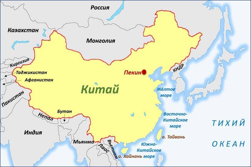 У Китайской народной республики есть выход к Тихому океану. Побережье этой страны омывают воды Восточно-Китайского моря, Южно-Китайского моря, Желтого моря. Морскими соседями этой страны являются:
