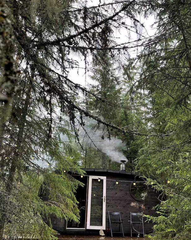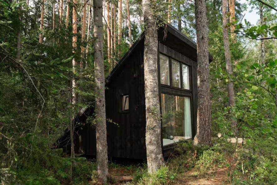Идете вы, значит, по лесу, и вдруг замечаете между сосен невзрачную чёрную будку. На первый взгляд — обычный сарай или домик лесника. Но стоит открыть дверь, и вы оказываетесь в стильном дизайнерском убежище, где огромные панорамные окна выходят в зелёный океан леса, а внутри — минимализм, дерево, уют и ощущение, будто время остановилось.