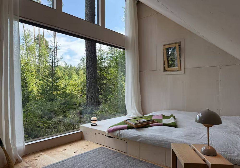Снаружи домик выглядит так, будто его специально сделали максимально неприметным, чтобы не нарушать гармонию леса. Но внутри всё продумано до мелочей. Натуральные материалы, простая, но изысканная мебель, приятные детали ручной работы. И главная «фишка» — огромные окна, через которые прямо с кровати можно смотреть на сосны и слушать, как по утрам поют птицы.