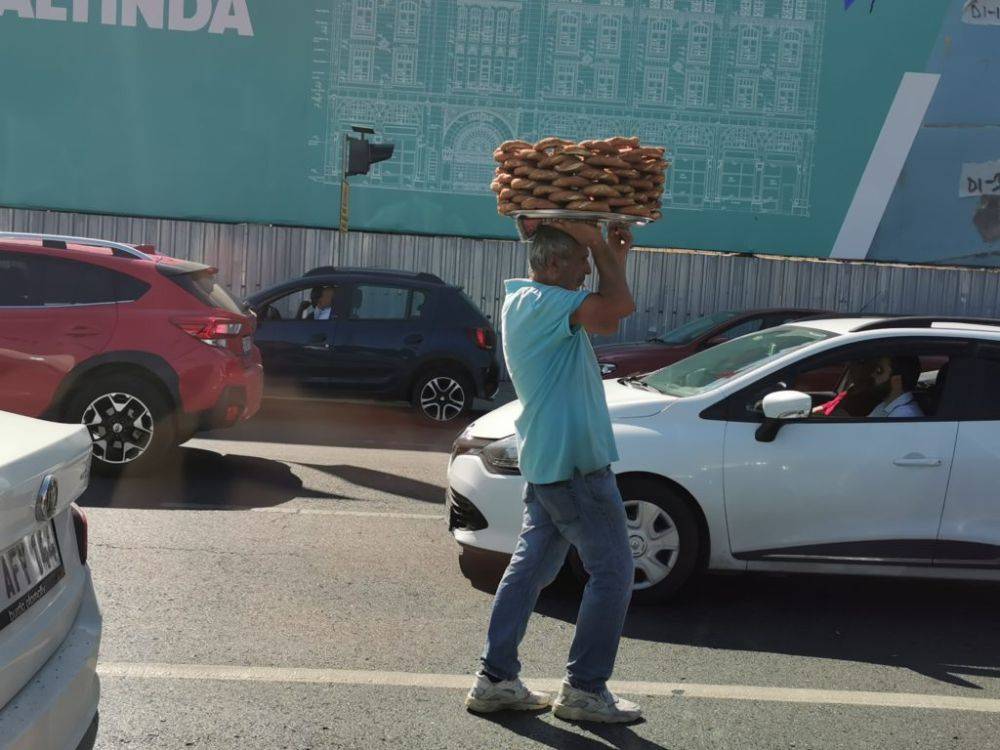 Одно из моих первых впечатлений от Турции – турецкие бублики. Точнее, продавец этих бубликов. Он ловко лавировал между машинами с огромным подносом, наполненным выпечкой, на голове. Мы остановились на светофоре, и я его сфотографировала. Бублик мы у него не купили, но я взяла на заметку это турецкое блюдо = очень интересно было попробовать.