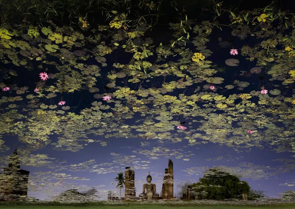 Вскоре после восхода солнца в тихом тайском регионе Сукхотай, название которого значит «Рассвет счастья», фигура Будды отражается в спокойной воде пруда. Чтобы передать дух момента, Джон Эдвардс перевернул фотографию, превратив отражение в иллюзию, где небо над Буддой стало полотном из плавающих цветов и дрейфующих растений.