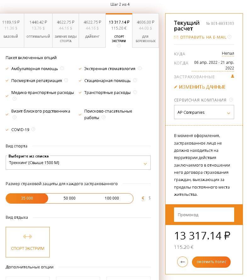 Нужно выбирать пакет страхования — Спорт Экстрим, Вид спорта — треккинг свыше 1500 м. Примерно так: