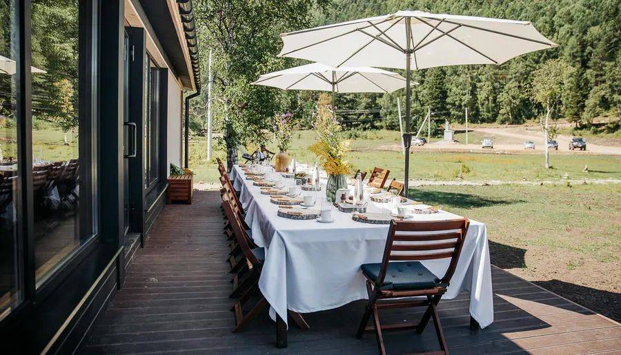 В ресторане подают блюда северной, русской и европейской кухни. Есть летняя терраса и меню с индивидуальным подбором блюд. Это место подходит для семейного отдыха, корпоративов и камерных праздников на природе.