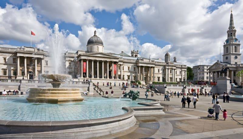 Эта известная достопримечательность находится на пересечении трёх улиц в центре Лондона. Её построили в XIX столетии на месте пустыря, на котором раньше были царские конюшни. Основа строительства – проект Ч.Бэрри. Согласно ему на площади были возведены: терраса с уступами с двух сторон, стены под наклоном, бассейны, фонтаны и пьедесталы с монументами знаменитых британцев. По центру стоит статуя адмирала Нельсона высотой в 51,5 метра. Её пьедестал украшают четыре панели с изображениями известных побед Нельсона.