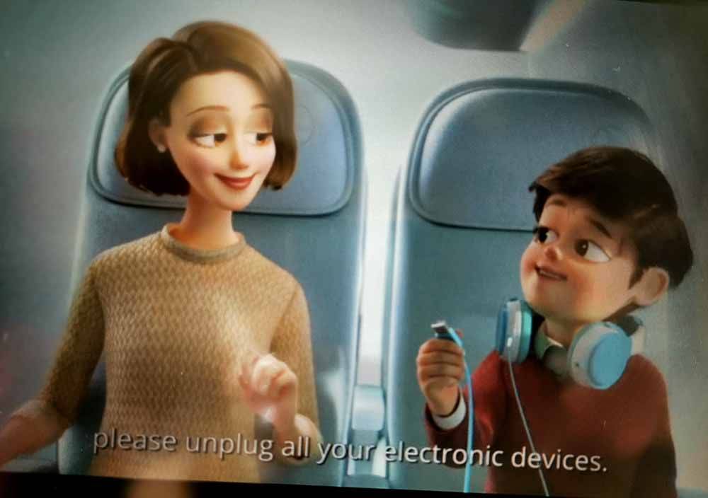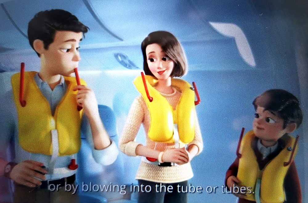Ещё запомнился мультик, который показывают перед полетом. Это инструкция про то, как надо брать спасательный жилет и маску в случае аварии. Персонажи в этом мультике делают всё с такими лицами, словно собираются на семейный пикник, а не принимают экстренные меры к спасению:) Расслабленно, неторопливо и с улыбкой. Это производит большое впечатление, если представить себе, в какой они по сюжету мультика находятся ситуации.