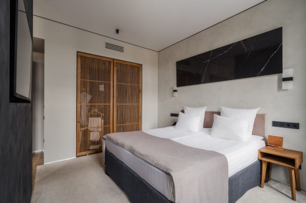 Дизайнерский апарт-отель в индустриальном здании с фокусом на индивидуальные пространства. Вместо типовых номеров — семь самостоятельных апартаментов, каждый со своим сценарием проживания. Формат подойдёт тем, кто живёт в городе активно и не хочет возвращаться в обезличенное пространство. Внутри — базовый набор для комфортного пребывания: двуспальная кровать, кондиционер, ТВ и собственная ванная.